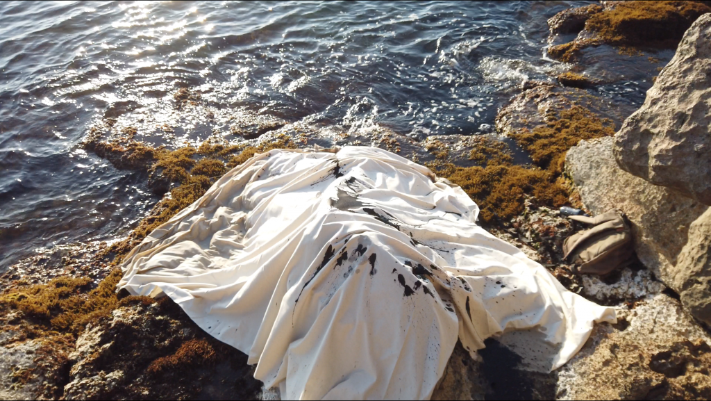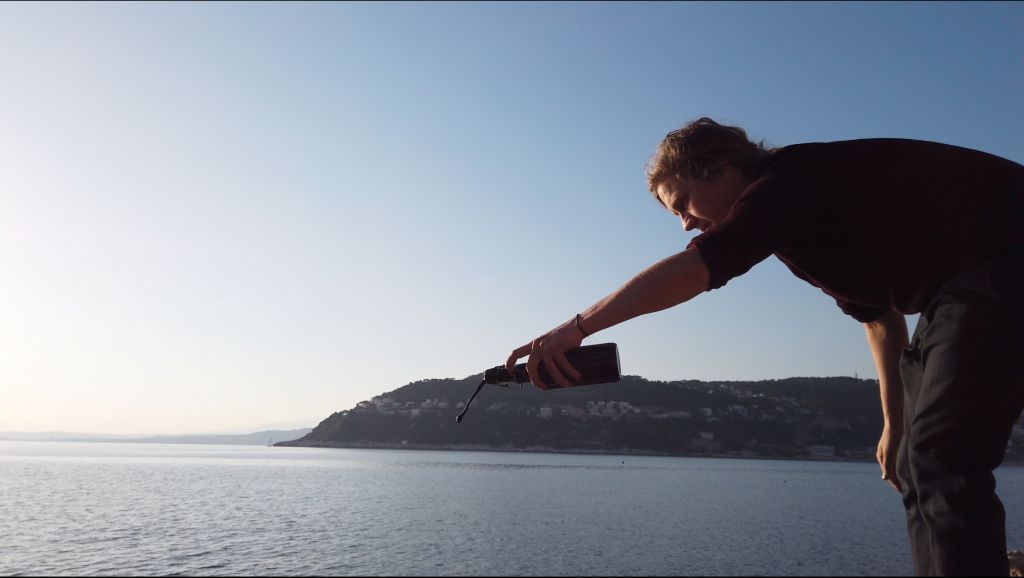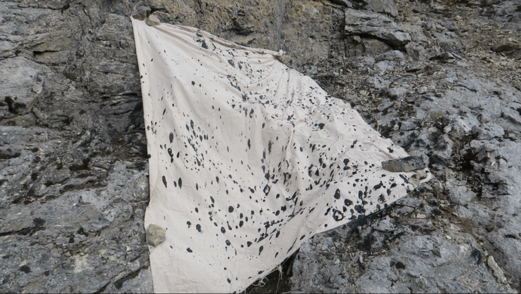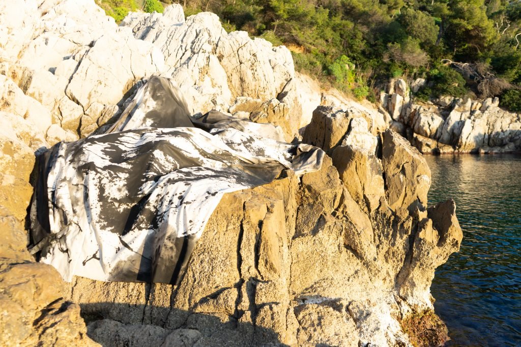 Au bout des montagnes, la mer, en 2019 Ecotopia cherche toujours à faire parler la nature à sa place, et continue par explorer les rives rocheuses, lisière entre terre et mer. D’un geste similaire à celui de la montagne, un jeté d’encre d’un point en aplomb sur une toile déposée sur la rive s’écoule et prend l’empreinte de celle-ci.