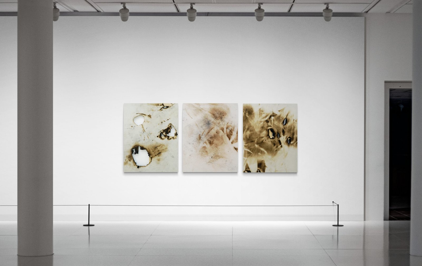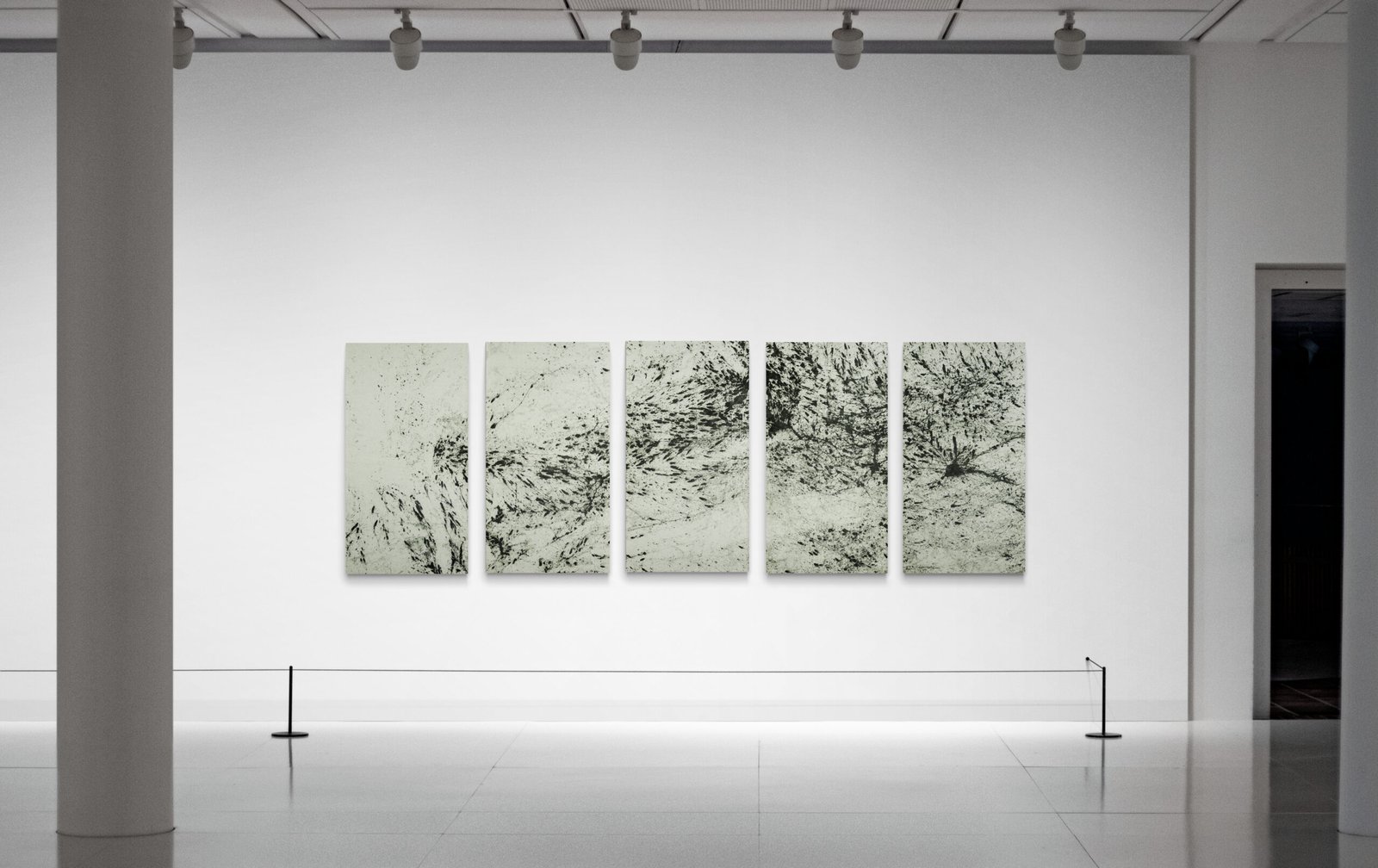 Alors que le drippings capte l’énergie de l’auteur, son dynamisme, sa présence, Ecotopia est davantage un retrait, pour laisser place à l’environnement. Si des traces de geste apparaissent, elles ne sont que résiduelles.