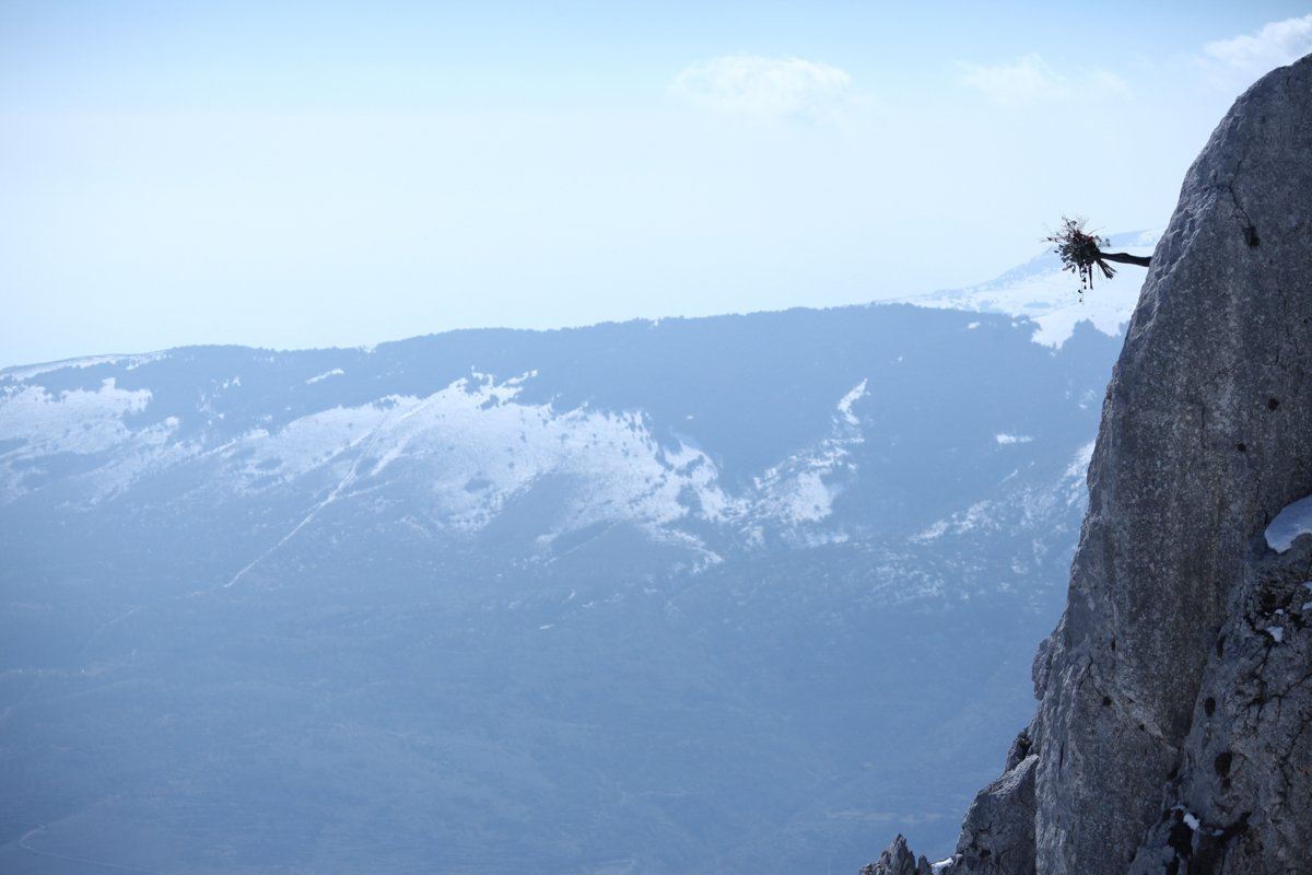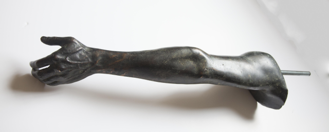 Braccio di bronzo fissato su una scogliera in cima a una montagna, offrendo fiori alla natura.