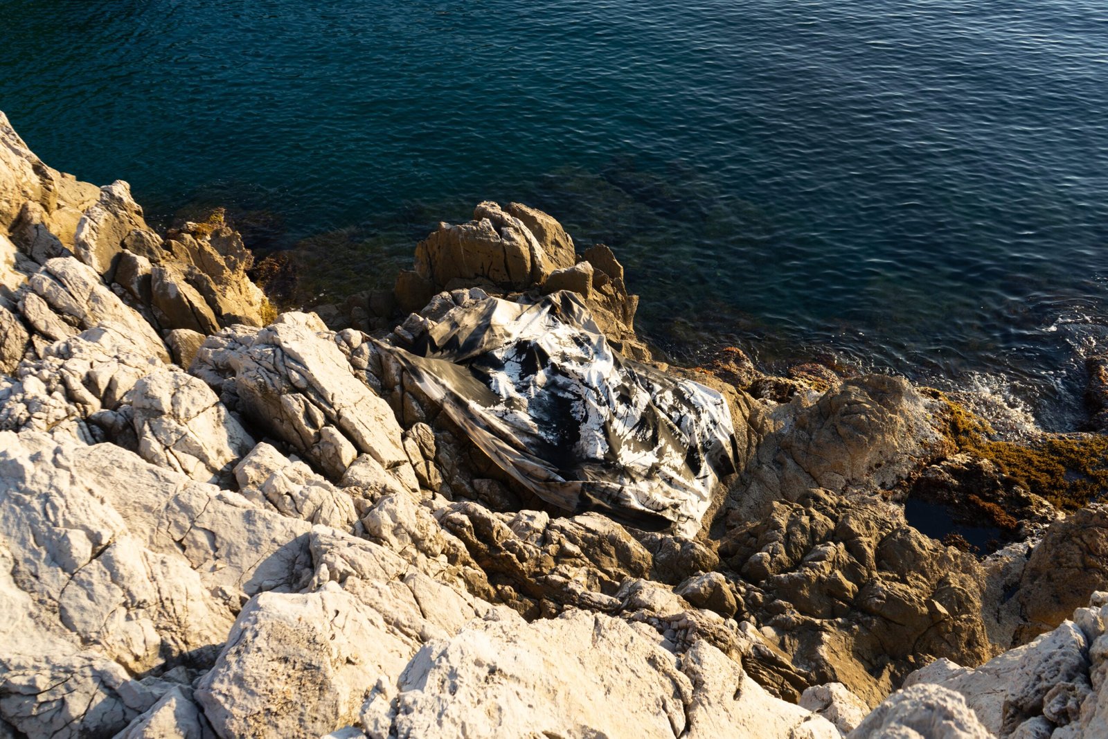 Un second temps Ecotopia visite les rives rocheuses pour laisser la mer dessiner, dans un procédé proche du premier, la mer vient recouvrir et diluer l’encre prise dans les empreintes du relief rocheux de la rive